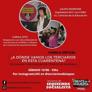 Desde la juventud de Izquierda Socialista junto a los terciarios hemos lanzado una campaña por la liberación de las plataformas educativas , la entrega de dispositivos , el aumento de becas y del presupuesto educativo. Vamos por la liberación del consumo de datos y de plataformas educativas como Jitsi, zoom, Google drive, YouTube. Queremos que todos los docentes y estudiantes que necesiten acceder de un dispositivo (netbooks, notebook, tablet) pueda acceder de manera gratuita y con el único requisito de formar parte de la comunidad educativa.